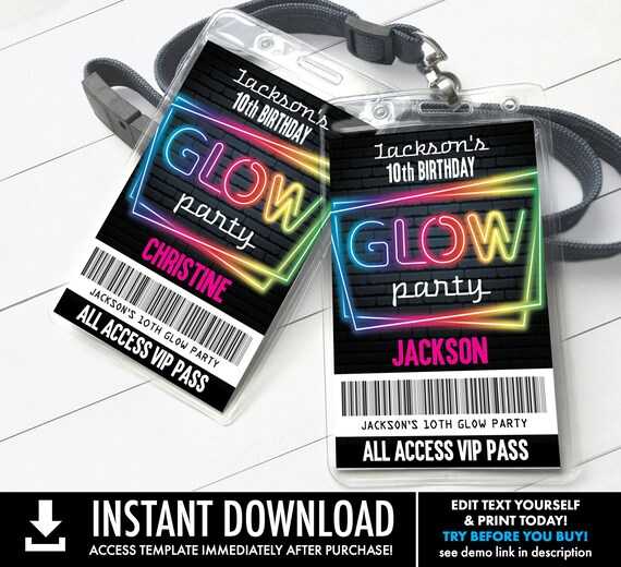 Neon Glow Party Vip Badge Neon Glow Theme Glow Party All Access Pass Self Edit With Corjl Instant Download Printable Template By Simplyeverydayme Catch My Party