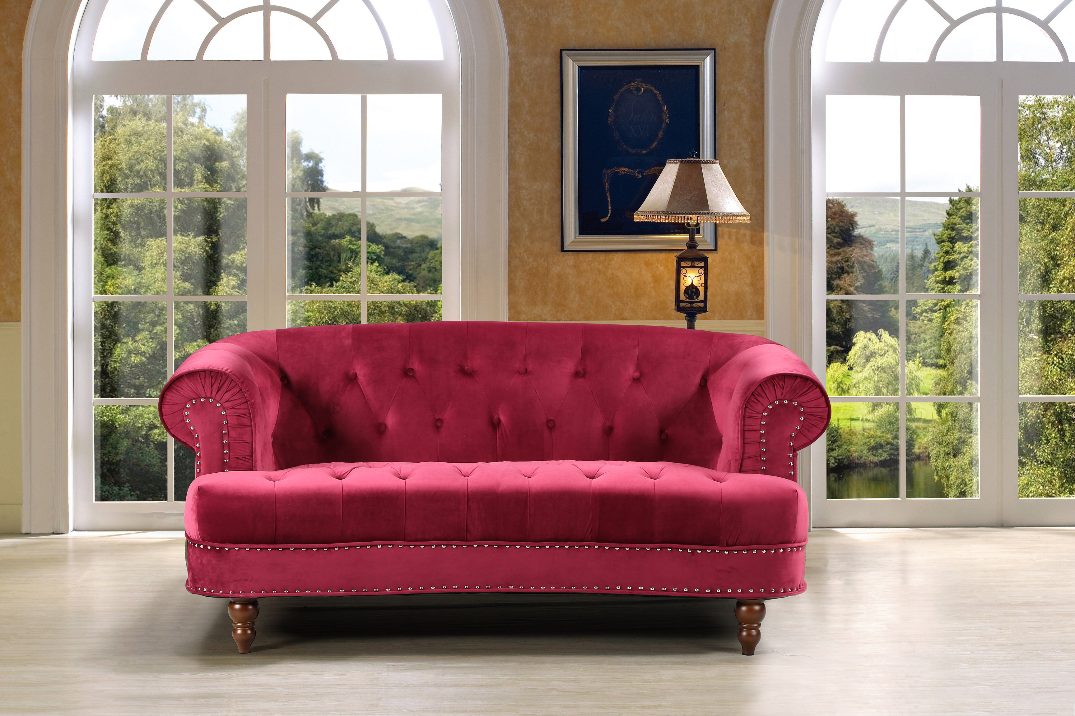 Amazon Com Jennifer Taylor Home La Rosa Collection Chesterfield Style Diamond Tufted Upholstered Velvet Sofa With Rolled Back Wooden Legs Burgundy Furniture Decor