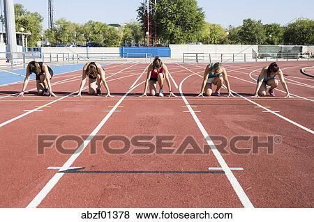 Female Runners On Tartan Track In Starting Position Stock Photo Abzf Fotosearch