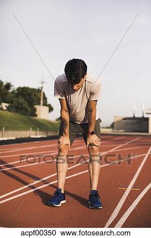 Young Runner Taking A Break On Tartan Track Catching His Breath Stock Image Acpf Fotosearch