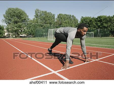 Runner On Tartan Track In Starting Position Stock Image Ahsf Fotosearch