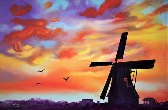 Windmill Sunset 24x36 61 X 91 Cn Oils On Canvas By Artist Etsy