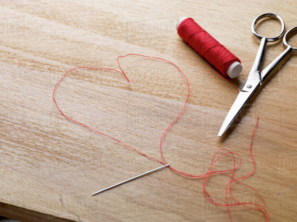 A Spool Of Red Thread Scissors Thread Needle And Thread Shaped Like A Heart Stock Photo Dissolve