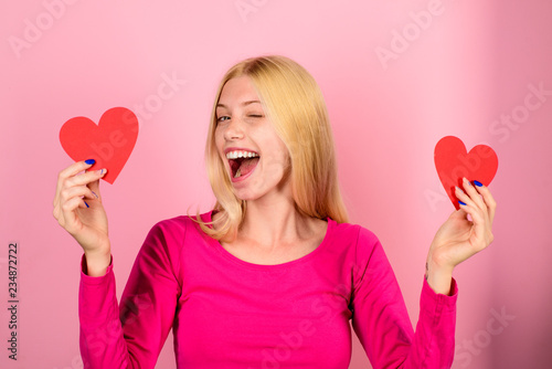Happiness Health Love Concept Smiling Girl With Red Hearts Winking Girl On Valentine S Day With Hearts