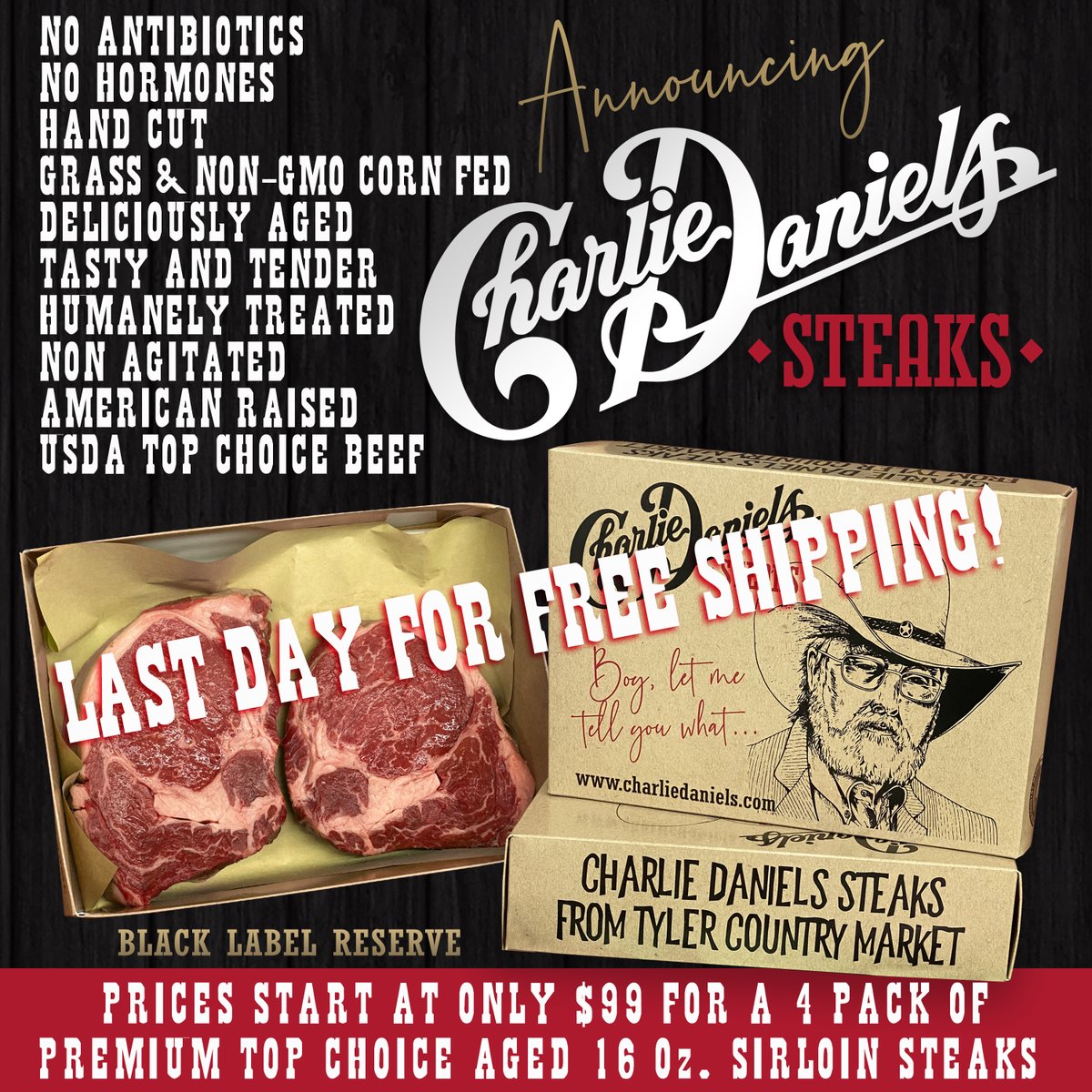Charlie Daniels Last Day For Free Shipping Charlie Daniels Black Label Reserve Steaks Are Hand Cut American Raised Usda Top Choice Beef Shipped Frozen Or Fresh Sales Also Benefit Cd S Veterans Foundation
