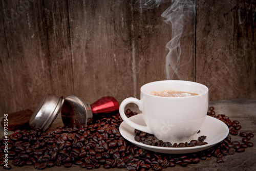 Premium Photo Cup Of Coffee With Smoke And Coffee Beans On Old Wooden Background