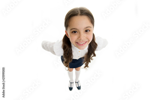 Happy Schoolgirl With Long Hair Isolated On White Little Girl Smiling In School Uniform Top View Cute Child With Adorable Smile Beauty Salon Look Great All Year Round Buy This Stock