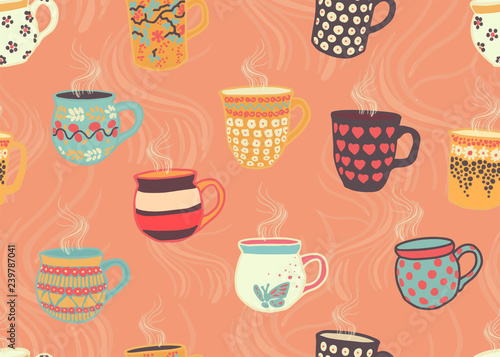 Tea Cups Seamless Pattern Background Coral Hot Steaming Cups Hygge Tea Time Hand Drawn Mugs Cute Retro Print For Packaging Fabric Menu Cafe Bakery Tea Party Card Winter Kitchen Decor Buy