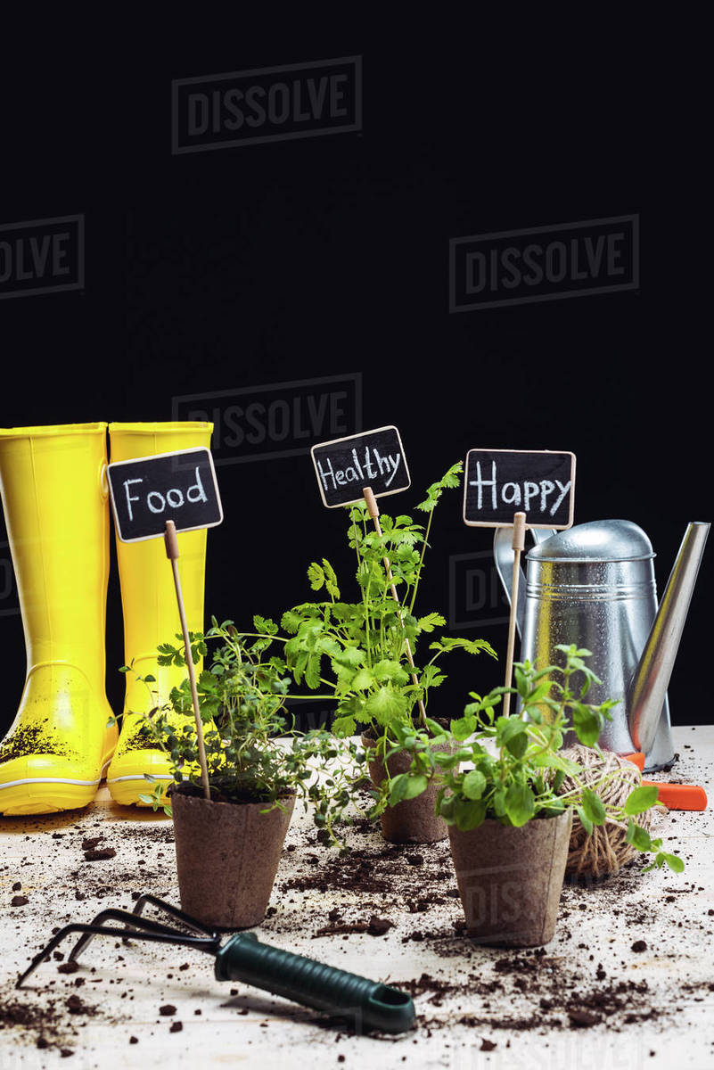 Yellow Rubber Boots Garden Tools And Green Potted Plants With Cards Stock Photo Dissolve