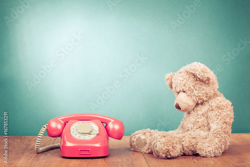 Retro Red Telephone And Teddy Bear Toy Near Aquamarine Wall Background Stock Photo Picture And Royalty Free Image Image