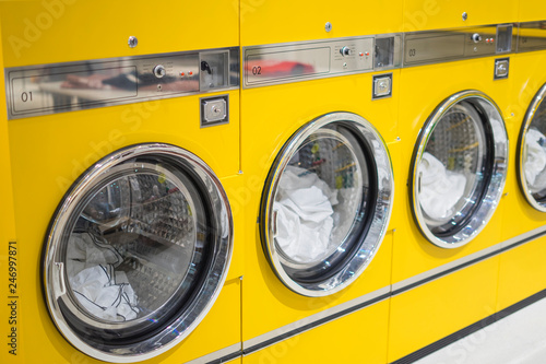 Yellow Industrial Washing Machines In A Public Laundromat Stock Photo Picture And Royalty Free Image Image