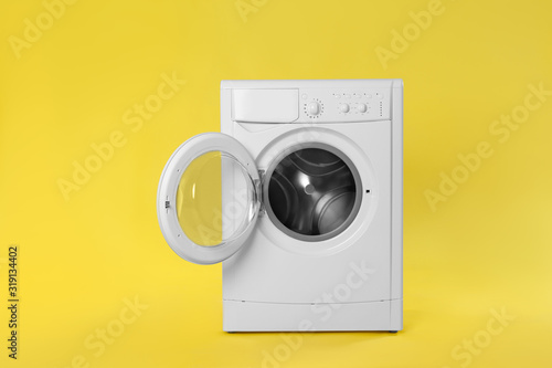 Modern Washing Machine On Yellow Background Laundry Day Buy This Stock Photo And Explore Similar Images At Adobe Stock Adobe Stock